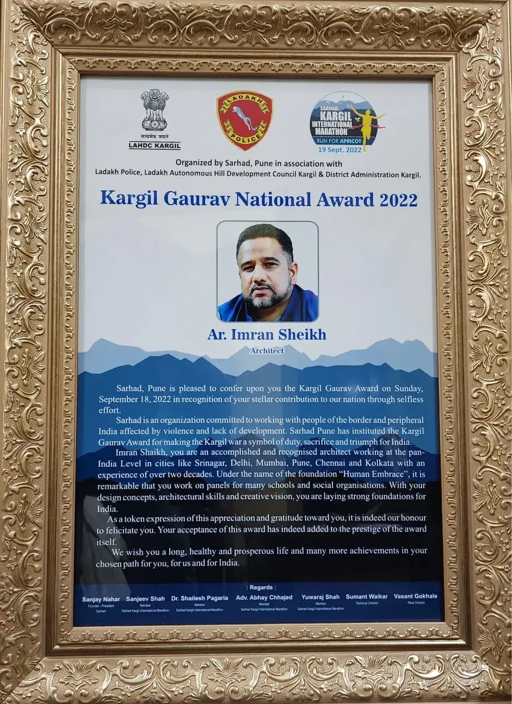 - Received the prestigious national award "KARGIL GAURAV AWARD " by Ladakh Police and Union Ministers At Kargil, Kashmir-Ladakh, in the month of September 2022 which was telecasted on televsion channels and covered in all the leadind newspapers on the country.
